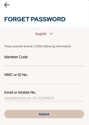 - Enter at least 2 of these information (your Member Code and/or your NRIC/ID Number and/or Email/Mobile Number)